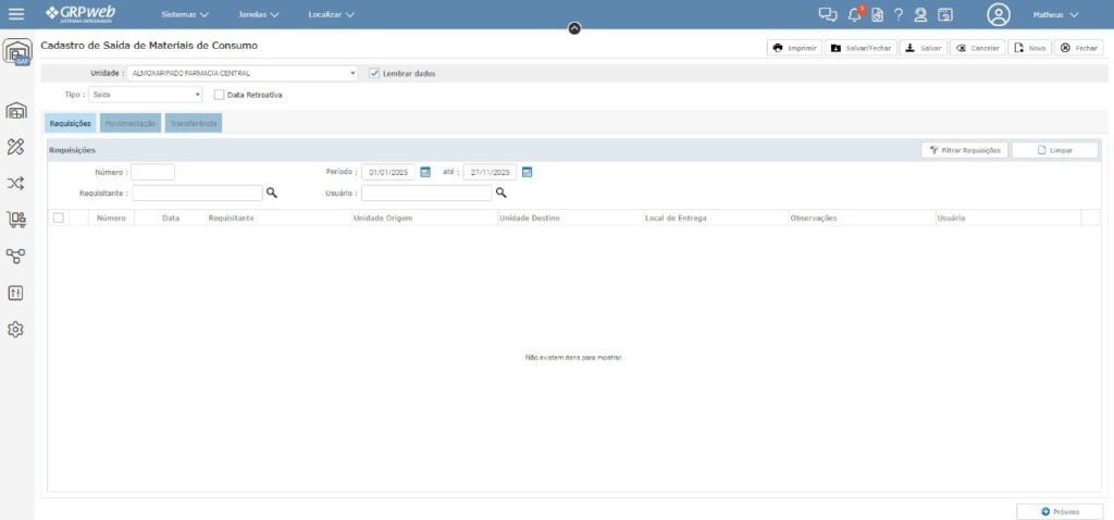 Um dos maiores benefícios foi a inclusão de funcionalidades que automatizam trâmites internos, como a transferência de materiais entre unidades. Antes, o processo era mais manual. Agora, a transferência é feita com total rastreabilidade.